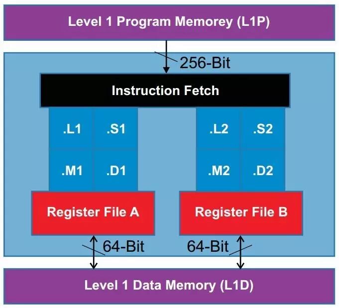 8个并行的功能单元,2组寄存器,分离的程序和数据存储;256bit取指包,能一次取指8个32bit的指令;2路64bit的数据加载/存储。这些都指向一个核心——并行处理。