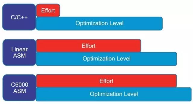 高度优化的c/c++代码性能可以非常接近手写的汇编代码。由于汇编代码的复杂性,我们可以优先选择C/C++进行程序编写。图1为TI提供的各编程语言及其优化版本间的运算性能比较示意图。