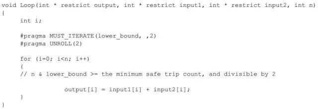 可以在代码中插入一些特定语法的编译指示指令,来告知编译器有关代码的一些信息。因为编译器在缺少信息的情况下,总是以最坏的打算来优化代码,如果编程者能提供一些关键信息,会大大帮助编译器做出好的决策。最常用的有MUST_ITERATE和UNROLL两种。
