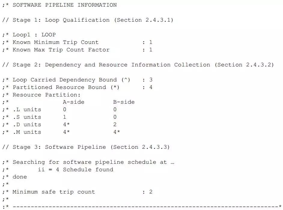 在CCS开发环境中,开启-O2/-O3优化选项,编译器将自动为合适的代码进行软件流水编排,因此编程者需要注意的是使设计的循环体符合软件流水编排的条件。