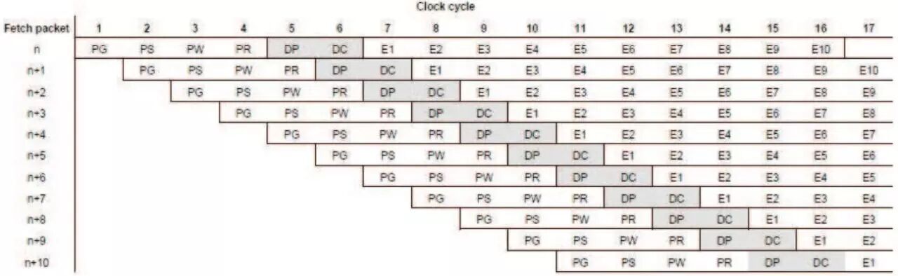 实际上,C6000架构把每一个阶段进一步划分为多个子阶段,每个子阶段消耗1个CPU cycle。