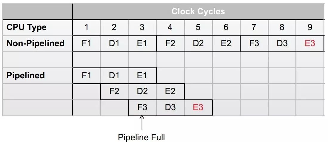 一个指令的处理过程并不是一步完成,它被分为三个阶段:取指(Fetch)、译码(Decode)、执行(Excute)。将每一个阶段放入独立的流程车间处理,形成流水线式的处理过程,可以大大加快指令的处理速度。