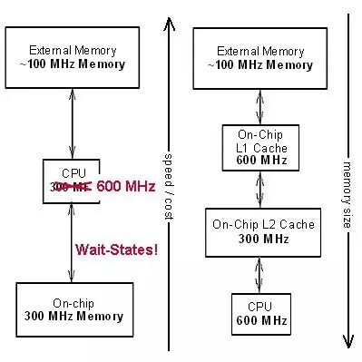 如图3所示,左右分别是平坦式存储器架构和2层cache的多层存储架构。在左边的架构中,即使CPU能运行在600MHz,但由于片内/片外存储器只能运行在300MHz/100MHz,CPU在访问存储时需插入等待周期。