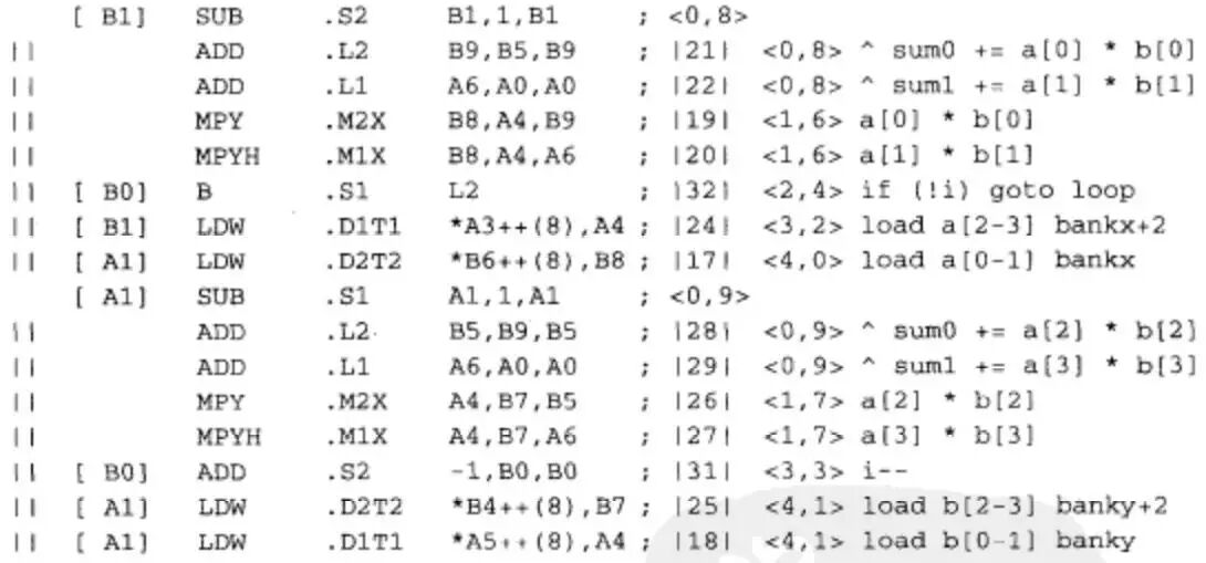 一个高效的软件流水核如下。在最后两条指令中,用LDW“字加载”命令,一个周期中同时加载a[0]、a[1]、b[0]、b[1]。