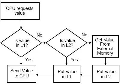对程序/数据进行访问时,CPU首先到L1 Cache中寻找,命中则直接访问,如果产生缺失,则继续在L2Cache中寻找,如果还未命中,则到片内RAM或片外RAM中寻址数据。