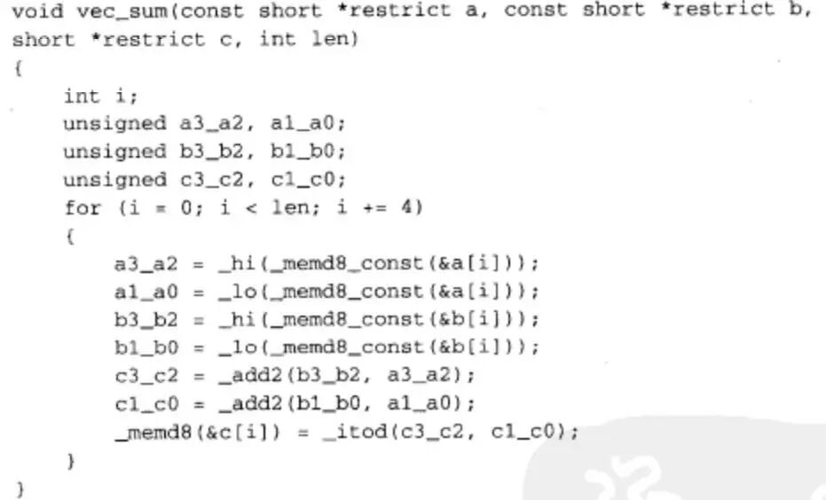 在C/C++代码中,可以使用_memXX()和_memXX_const()内联函数对非对齐的字和半字进行访问。一般这类内存访问可以与_hi()、_lo()和_itod()等数据解包和打包内联函数联合使用,下面是一个使用示例: