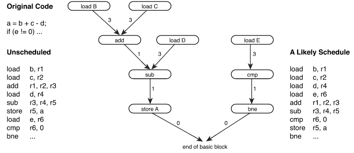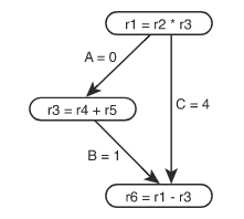 给定如上所示的依赖关系图,指令调度算法必须找到图表的评估顺序,其所有父节点在其子节点之前,至少要留有不少于父子节点间路径加权和的周期数。如果满足这些要求,则被调度的代码序列的语义属性不会改变。