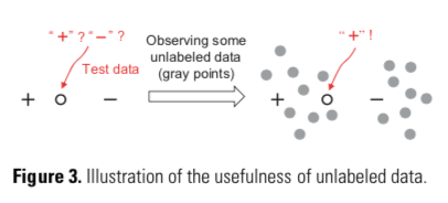图3给出了一个直观的解释。如果我们只能根据唯一的正负样本点来预测,那我们就只能随机猜测,因为测试样本恰好落在了两个标注样本的中间位置;如果我们能够观测到一些未标注数据,例如图中的灰色样本点,我们就能以较高的置信度判定测试样本为正样本。在此处,尽管未标注样本没有明确的标签信息,它们却隐晦地包含了一些数据分布的信息,而这对于预测模型是有用的。