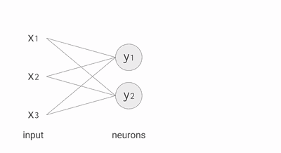 其中,公式里面的变量l和j表示的是第 l 层的第 j 个神经元,ij 则表示从第 i 个神经元到第 j 个神经元之间的连线,w 表示的是权重,b 表示的是偏置,后面这些符号的含义大体上与这里描述的相似,所以不会再说明。下面的 Gif 动图可以更加清楚每个神经元输入输出值的计算方式(注意,这里的动图并没有加上偏置,但使用中都会加上)