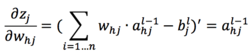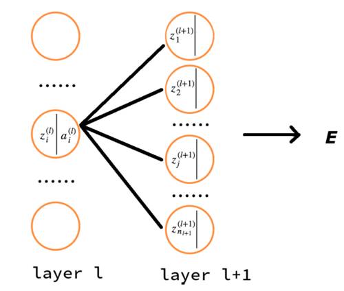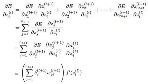 也即是说我们可以将 E 看做是 l+1 层所有神经元输入值的 z 函数,而上面式子的 n 表示的是 l+1 层神经元的数量,再进行化简后就可以得到上面所说的式子。