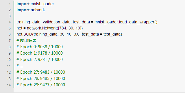 最后,我们可以利用这个源码来训练一个手写数字识别的神经网络,并输出评估的结果,代码如下: