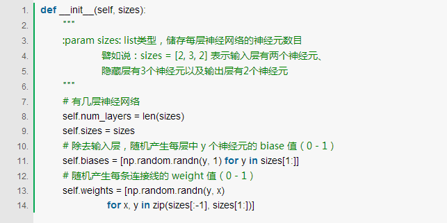 使用 Python 实现的神经网络的代码行数并不多,仅包含一个 Network 类,首先来看看该类的构造方法。