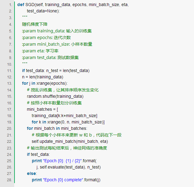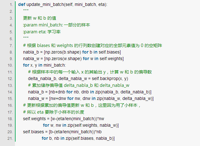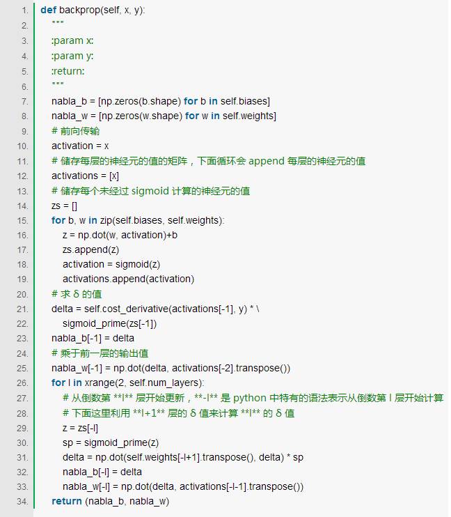 下面这块代码是源码最核心的部分,也即 BP 算法的实现,包含了前向传输和逆向反馈,前向传输在 Network 里有单独一个方法(上面提到的 feedforward 方法),那个方法是用于验证训练好的神经网络的精确度的,在下面有提到该方法。