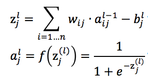 除了输入层的神经元,每个神经元都会有加权求和得到的输入值 z 和将 z 通过 Sigmoid 函数(也即是激活函数)非线性转化后的输出值 a,他们之间的计算公式如下