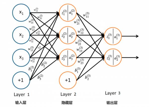 神经网络由三部分组成,分别是最左边的输入层,隐藏层(实际应用中远远不止一层)和最右边的输出层。层与层之间用线连接在一起,每条连接线都有一个对应的权重值 w,除了输入层,一般来说每个神经元还有对应的偏置 b。
