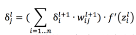 首先我们看到 l 层的第 i 个神经元与 l+1 层的所有神经元都有连接,那么我们可以将 δ 展开成如下的式子: