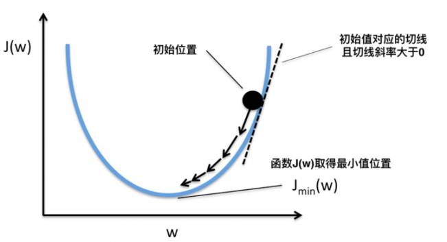 现在,我们要求当 w 等于什么的时候,J(w) 能够取到最小值。从图中我们知道最小值在初始位置的左边,也就意味着如果想要使 J(w) 最小,w的值需要减小。而初始位置的切线的斜率a > 0(也即该位置对应的导数大于0),w = w – a 就能够让 w 的值减小,循环求导更新w直到 J(w) 取得最小值。如果函数J(w)包含多个变量,那么就要分别对不同变量求偏导来更新不同变量的值。