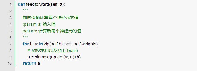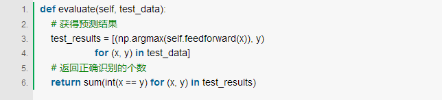 接下来则是 evaluate 的实现,调用 feedforward 方法计算训练好的神经网络的输出层神经元值(也即预测值),然后比对正确值和预测值得到精确率。