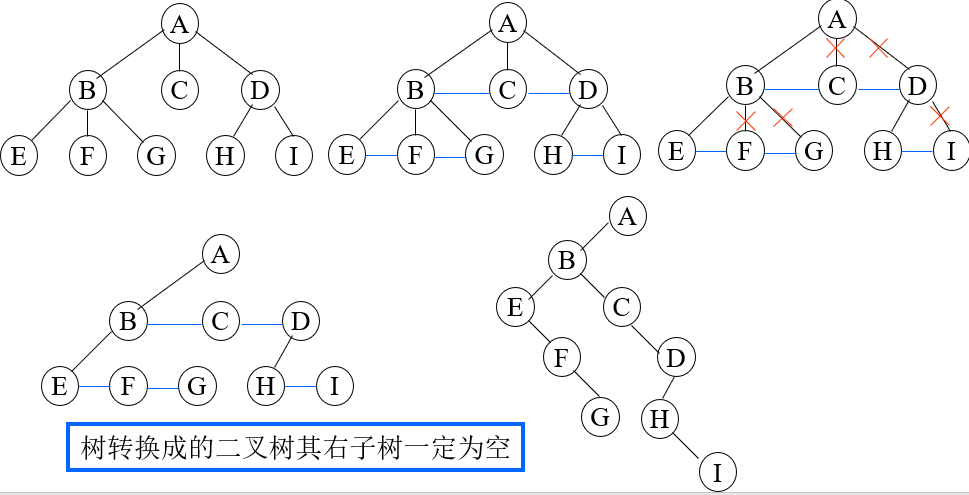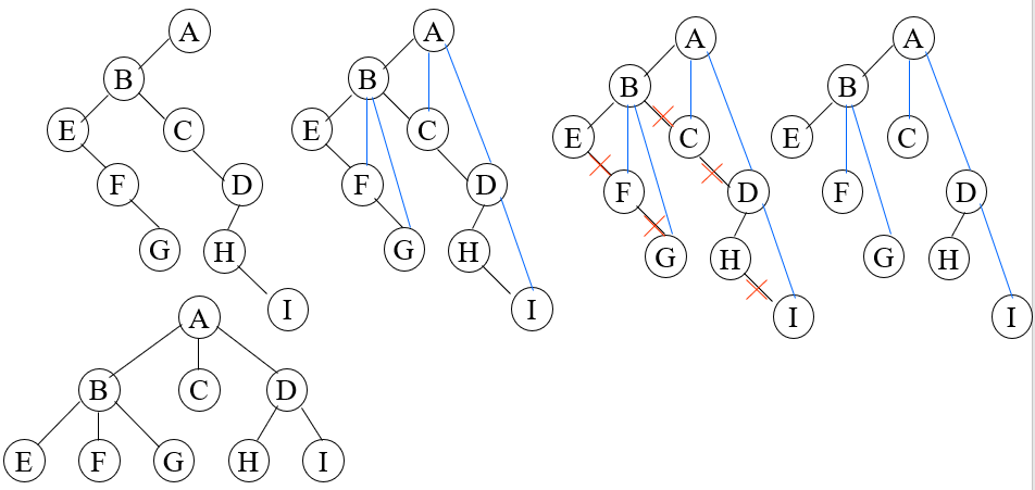 抹线:对每个结点,除了其左孩子外,去除其与其余孩子之间的关系