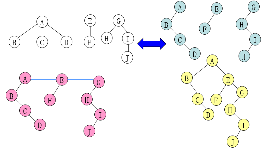 以第一棵树根结点为二叉树的根,再以根结点为轴心,顺时针旋转,构成二叉树型结构