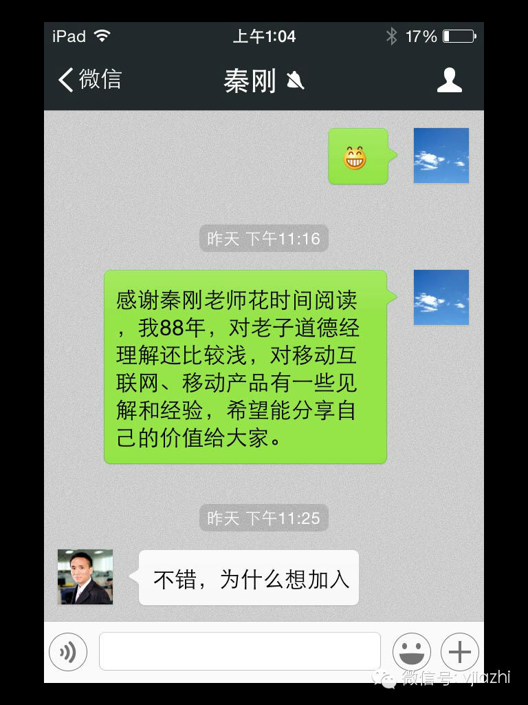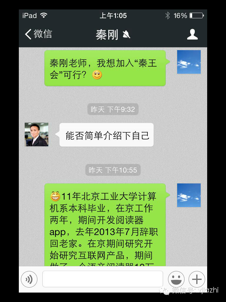 今天我想告诉大家一件事,就是我通过了秦刚老师的认真盘问和审核,已经有资格加入“秦王会”。具体谁是秦刚(曾是IT世界网CEO,39健康网联席总裁), 什么是“秦王会”,大家可以看看秦刚老师写的博文:http://www.iqingang.com/post/68,“秦王会”不是每个人都收,只有过了秦刚老师的严厉审核询问才能才可加入。大家看看秦王会里面的成员资料就知道拉。下面的截图是我俩交谈的片段: