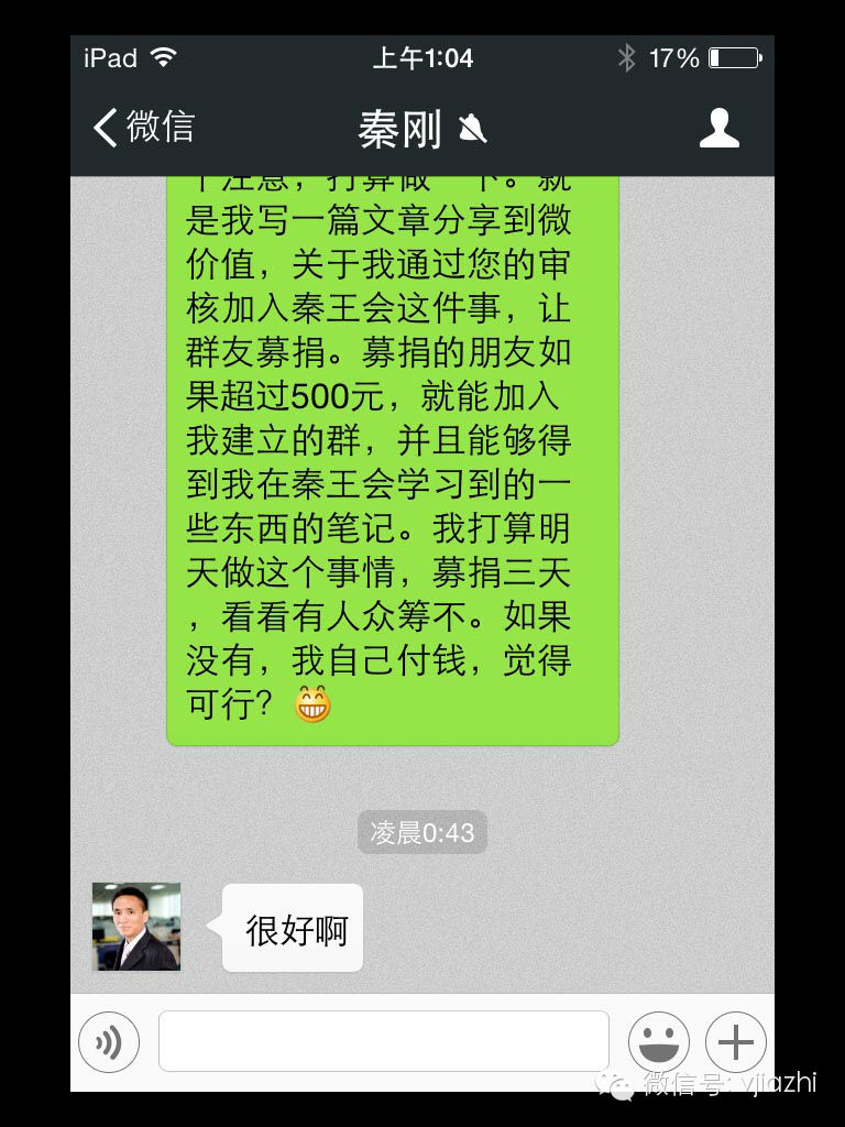 关于微价值的建立,其实是受到秦刚老师的启发,和秦刚老师稍早前也算认识。入“秦王会”需要交1.8万元人民币,本人想通过众筹的方式,这个事情我跟秦刚老师也说过: