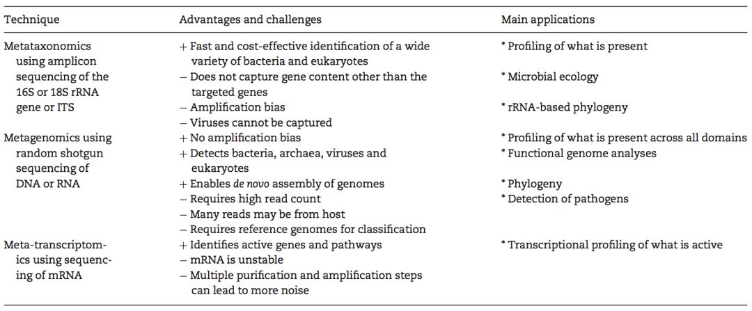 建立在高通量测序基础上的微生物群落研究,当前主要有三大类:基于16S/18S/ITS等扩增子做物种分类的Metataxanomics、鸟枪法打断全基因组DNA序列的Metagenomics和基于mRNA信息的宏转录组方法Meta-transcriptomics。
