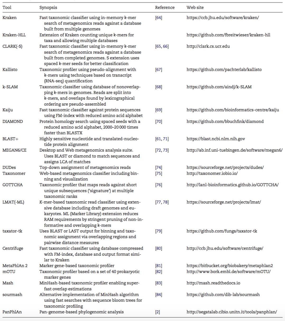 在17年发表于Briefings in Bioinformatics的一篇题为《A review of methods and databases for metagenomic classification and assembly》的综述中,也有很多可参考的思路和软件汇总。