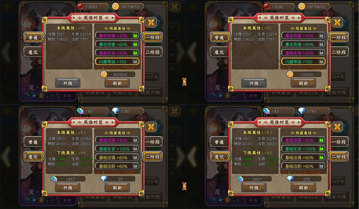 有的游戏中,英雄的时装属性被设计成一个区间值,分为6种,每种加成分10%,30%,60%,100%,150%,200%,时装共有4个属性,当然解锁全部4个属性需要耗费大量金币和钻石等特殊道具。当用户将某条属性刷新成为自己希望的属性,如200%+闪避,其他属性很可能特别垃圾,那么我就需要锁定这个属性,然后继续刷新,比如无锁定刷新耗费1000金币一次,那么锁定一个技能后刷新耗费3000金币,锁定两个技能刷新则耗费变成100钱币,锁定三个技能刷新耗费300钱币,就这样,一套时装可能耗费几千钱币都是正常,真是套路满满,但是玩家就是会为这种确定性买单。