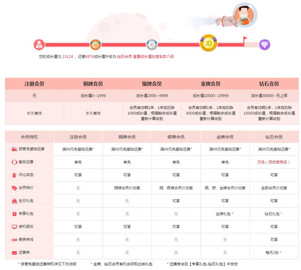 互联网产品普遍会涉及一些特权会员,如腾讯的各种钻石特权,京东的五级会员制度,实际上也是五级VIP设置,通过会员特价,生日礼包,专项礼包等服务区分特权,从下图可以看出,京东的各级会员没有太大的特权差异,所以期望用户为了某级会员而付费购物可能性不大,详情见下图: