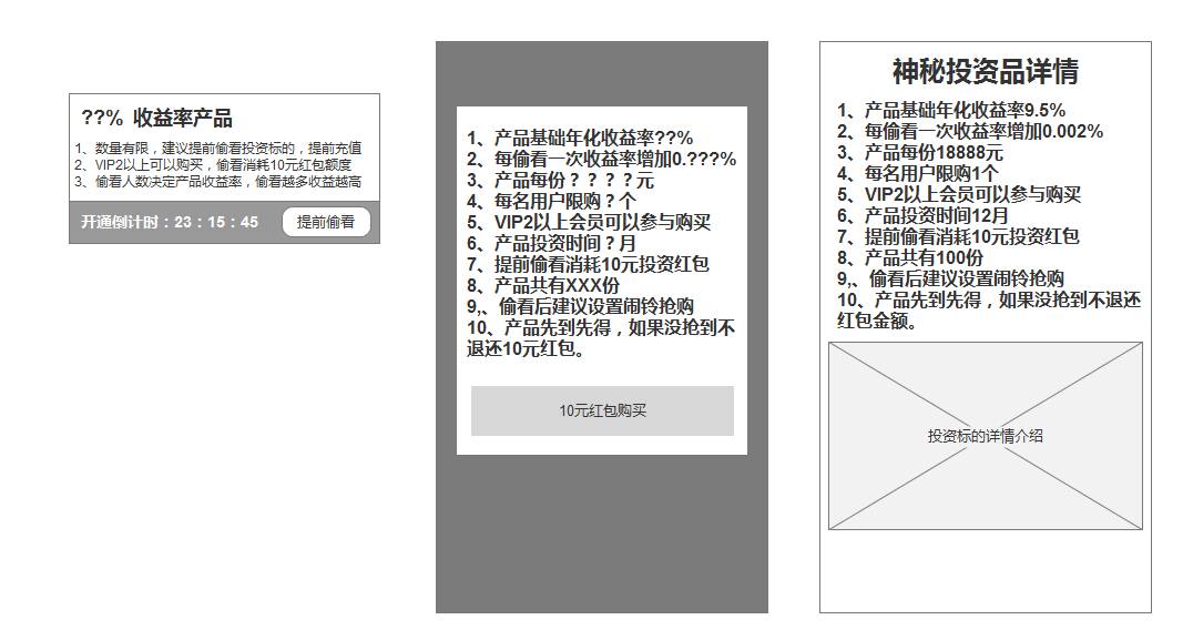 还是以P2P平台为例,按照上文所述的设计思路。首先,P2P平台用户希望获取高额的投资回报率,那么我们设计一个收益率未知的产品,提醒用户数量有限,金额不固定建议提前进行打款。设置购买门槛,比如VIP2的用户(投资满2000元的用户)可以参加,偷看红包需要消耗10元红包,用户付出成本,偷看人数越多收益率越高,考虑根据ROI设置上限,或者完全通过后台控制其上限,提供倒计时,制造紧张氛围,点击偷看,可以看到产品核心数字格式,年化收益率双问号,投资时间单个问号刺激用户遐想,其他信息用问号显示,刺激购买,如果用户没有10元红包,可以设置直接跳转投资拿红包活动,比如投资2000元可以获得10元红包,同时成为VIP2会员,消耗红包后查看到产品详情,并且看到产品的收益率逐渐变化。这样就是一个用户消耗金币或钱币购买信息时间差的活动,而且鼓励用户分享出去,让更多用户偷看,增加收益率,如果控制好的话因为大量红包回收,P2P平台这款产品的年化平均收益率可以控制在10%以内,如果用户偷看了,但是没有抢购到产品,可以考虑赠送安慰投资卷,如果分享带来多人偷看的ID,建议赠送足额优惠劵,刺激后续活动的关注和推广。