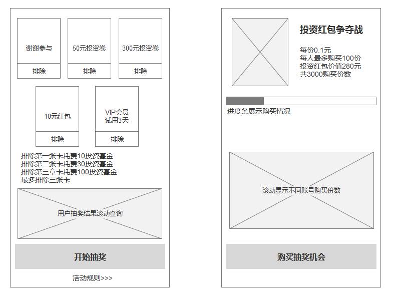 我们设计抽奖规则或者进阶规则时,是否可以考虑使用类似于游戏中的设计,通过出售确定性获利呢?我们不妨开一下脑洞,类似游戏中的设置,做了一个类似与游戏中的抽奖设计,当用户满足某个要求后进入抽奖页面,页面展示五个投资卡片,用户可以选择排除或直接开始抽奖,排除卡片次序不同消耗投资基金不同,其中放置大奖,下方滚动展示其他用户抽到大奖和二等奖的结果,通过数据整体平衡抽奖结果。第二个设计是仿照黄金钱包设计的抽奖,所谓小赌怡情,金额不同过大,刺激用户活跃,参与到新玩法的尝试中,可以根据后台数据进行中奖概率控制。两个设计都借鉴了游戏中的花钱购买确定性案例,希望对大家有所帮助,刺激大家打开脑洞。