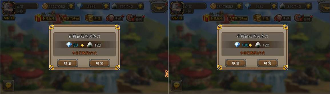 还一种购买时间就是购买体力,我们前文提到了时间币通常体现为行动力或体力,玩家的很多行为消耗体力,而体力的弥补一般是采用10分钟或5分钟增加一点的设计,上限不同,随着玩家等级逐级增加,其体力上限会有增幅,如下图所示,当我是VIP6级的时候,每天可以购买7次体力,每次购买120体力,因为5分钟产生一体力,相当于我购买了600分钟,前两次购买每次消耗50钻石,后三次购买每次消耗100钻石,6次开始每购买120体力需要消耗200钻石,此处与购买特权结合,如果买够全量,我需要消耗600钻石,相当于每天消费60元,共计购买3600分钟,每天合计购买了60小时时间。