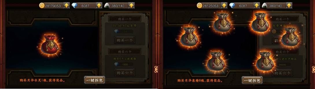 大量卡牌游戏都会设计抽英雄,玩家耗费280钻石可以抽取一个福袋,打开后未必出现三星英雄,如果用户花费1666钻石,则可以开6个福袋,其中必中三星英雄,但是也未必是你希望获得哪个英雄,如下图所示: