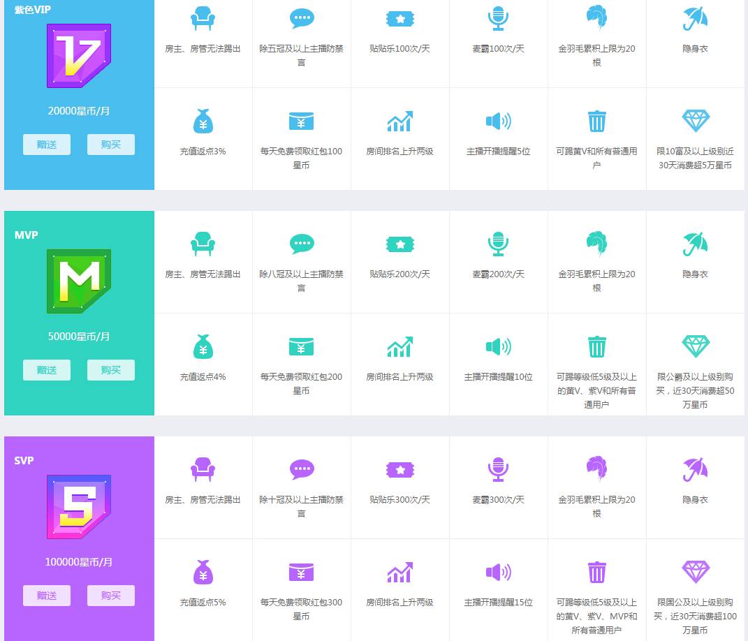 下图为酷我秀场VIP设计,共分为四类VIP,VIP特权根据不同等级的处理权限而设,通过禁言,踢人,麦霸等对抗性权限设置,区分不同玩家的身份,进而刺激用户疯狂充值和消费,而不同的vip标签进入房间,主播都会很客气的说一声:“欢迎XXXX进入房间,"给用户一种瞬间当土豪的感觉。