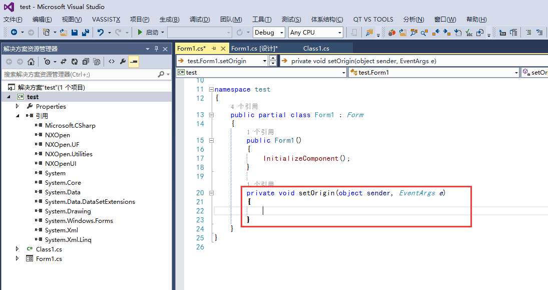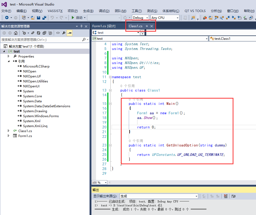 1 public static int Main() 2 { 3 Form1 aa = new Form1(); 4 aa.Show();//1.使用.show()为非模态对话框2.使用.ShowDialog()为模态对话框 5 6 return 0; 7 } 8 9 public static int GetUnloadOption(string dummy) 10 { 11 return UFConstants.UF_UNLOAD_UG_TERMINATE;//卸载方式显示卸载 12 } 13 14 Caesar卢尚宇 15 2020年3月1日