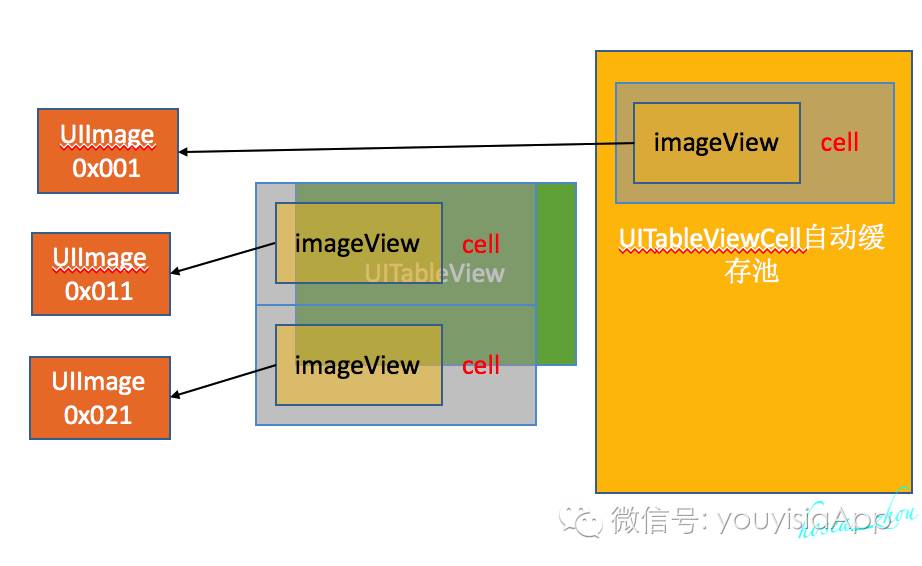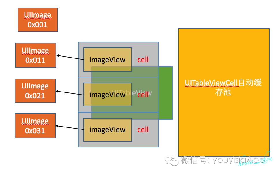 当有一个cell被推到屏幕之外时,系统会自动将这个cell放入自动缓存池。注意:cell对应的UIImage图片数据模型并没有清空!还是指向上一个使用的cell。