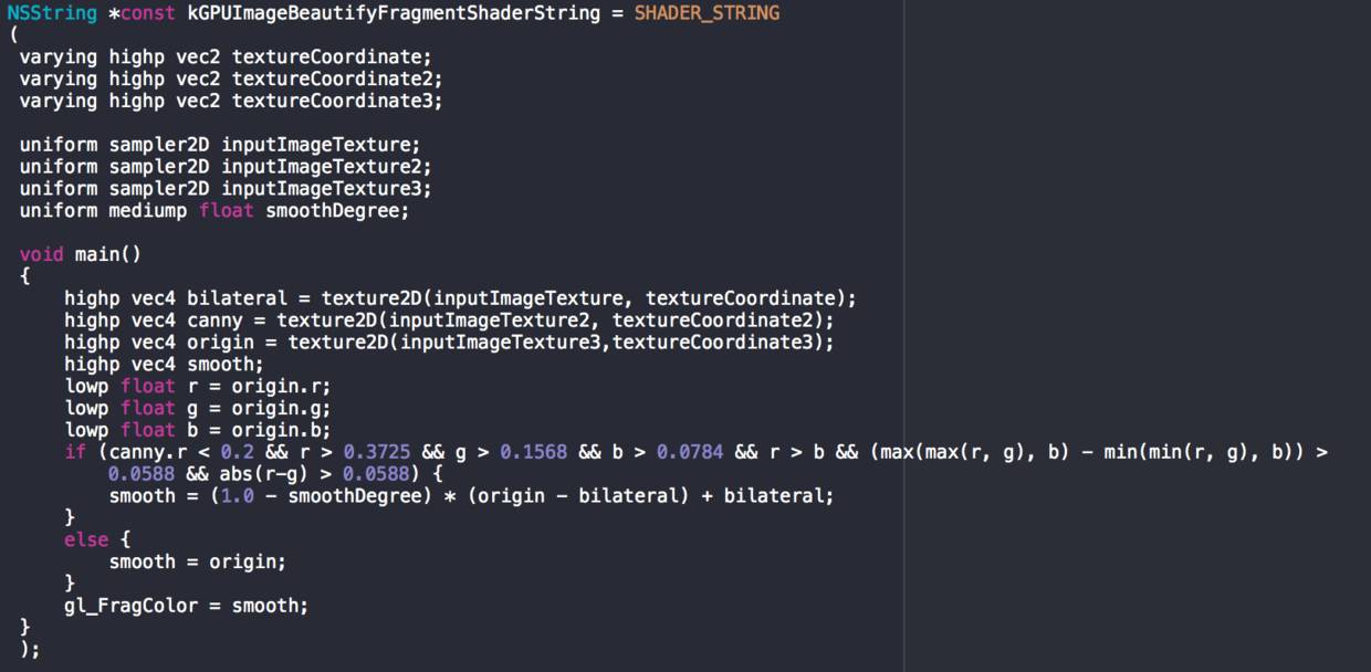 我所采用的磨皮算法是基于双边滤波的,主要是考虑到它同时结合了像素间空间距离以及像素值本身的差异。当然也不一定要采用双边滤波,也有通过改进高斯模糊(结合像素值差异)来实现磨皮的,甚至能取得更好的效果。另外GPUImageBeautifyFilter不仅仅具有磨皮功能,也实现了log曲线调色,亮度、饱和度的调整,具体详情可以参见demo 。