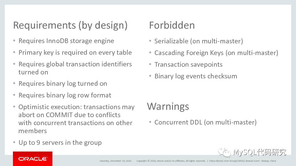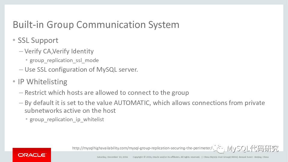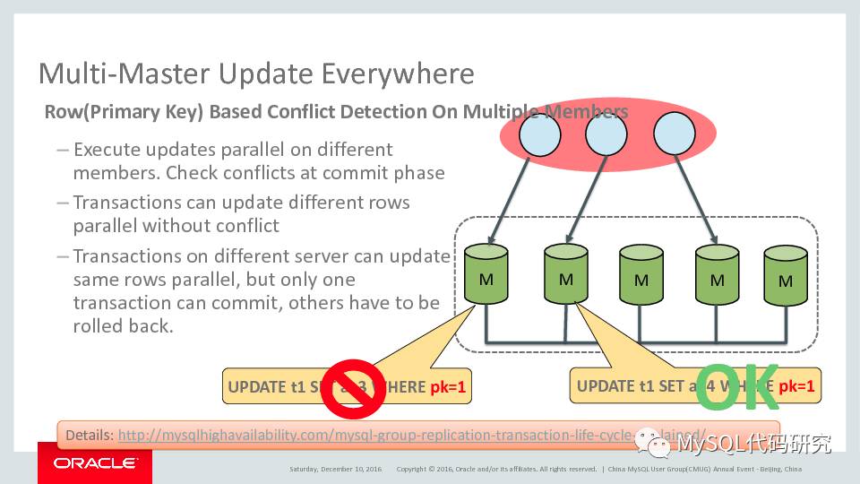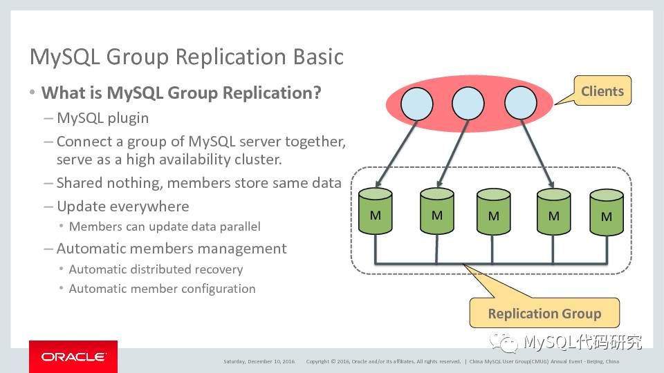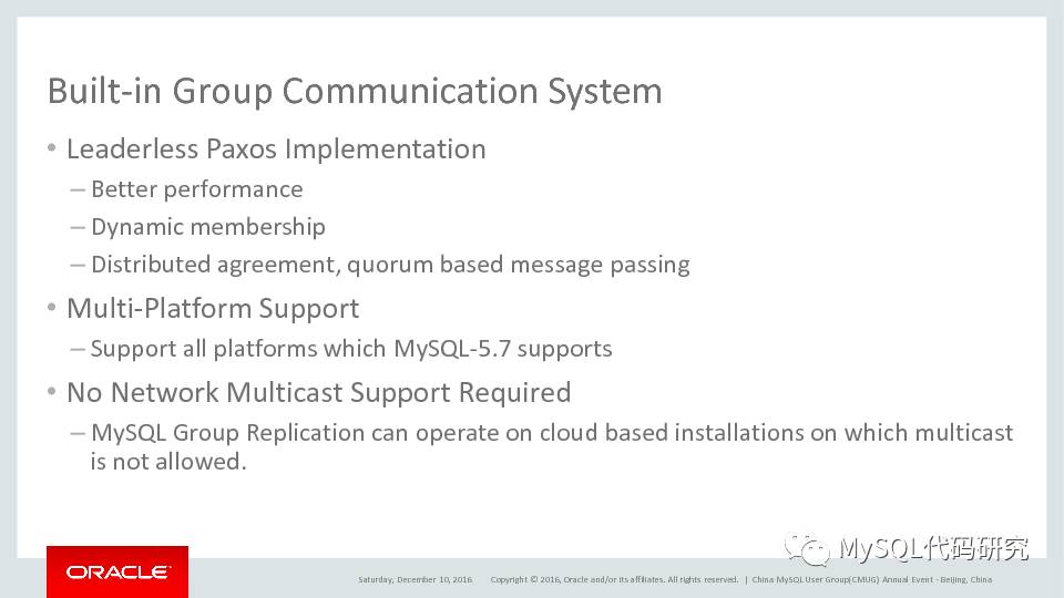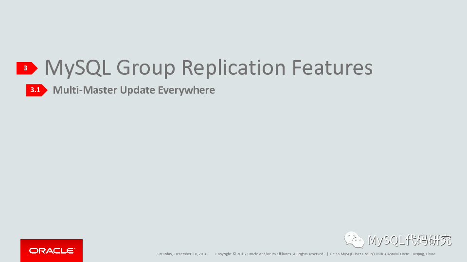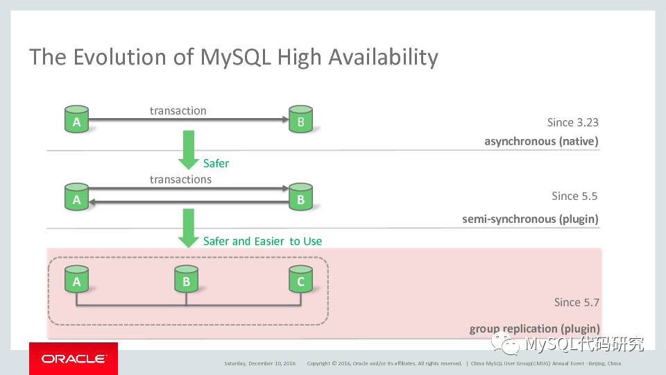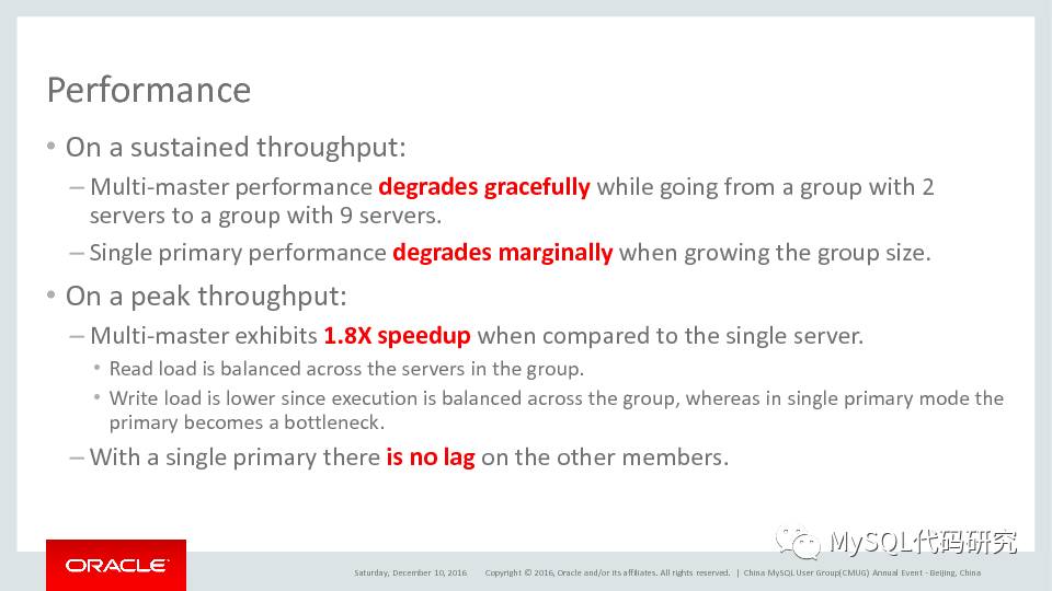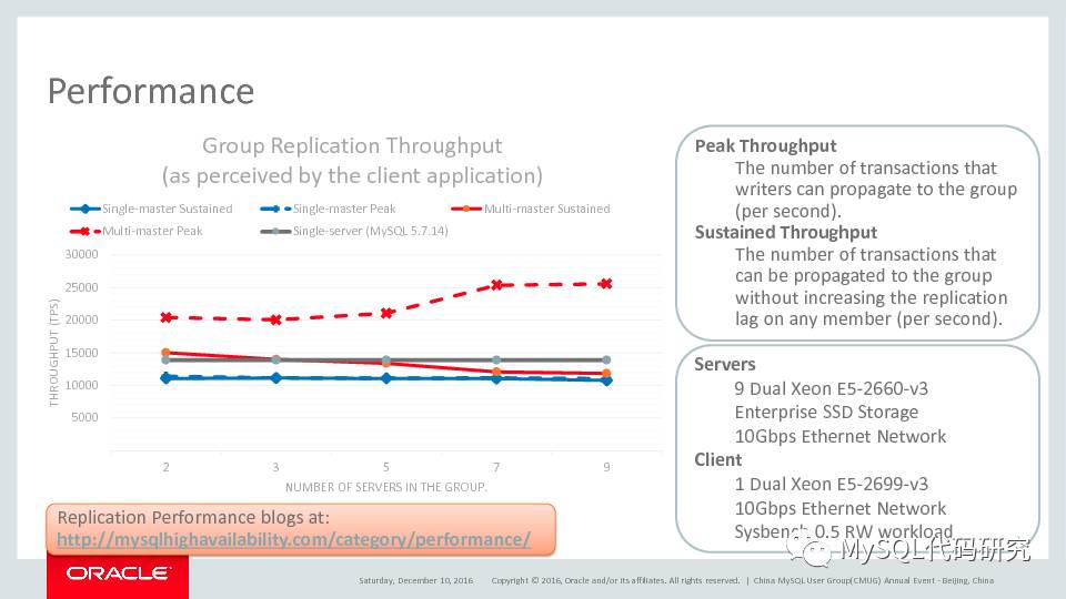 ACMUG年会上很多人问:有没有对比过Group Replication和异步复制的性能。MySQL Replication Team已经做了详细的性能对比,相关文章基本就绪,不久就会发布到官方博客上。另外还有一篇对比Group Replication和Galera功能的文章也会一同发布。官方博客地址如下: