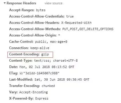 重启服务,观察网络面板里面的 response header,如果看到如下红圈里的字段则表明 gzip 开启成功 :