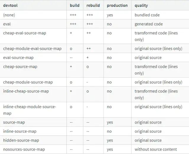 SourceMap 的可选值如下(+ 号越多,代表速度越快,- 号越多,代表速度越慢, o 代表中等速度 )