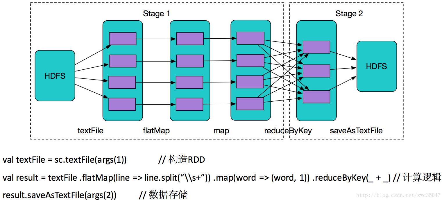 上图是一个Spark的wordcount例子,根据上述stage划分原则,这个job划分为2个stage,有三行,分别是数据读取、计算和存储过程。