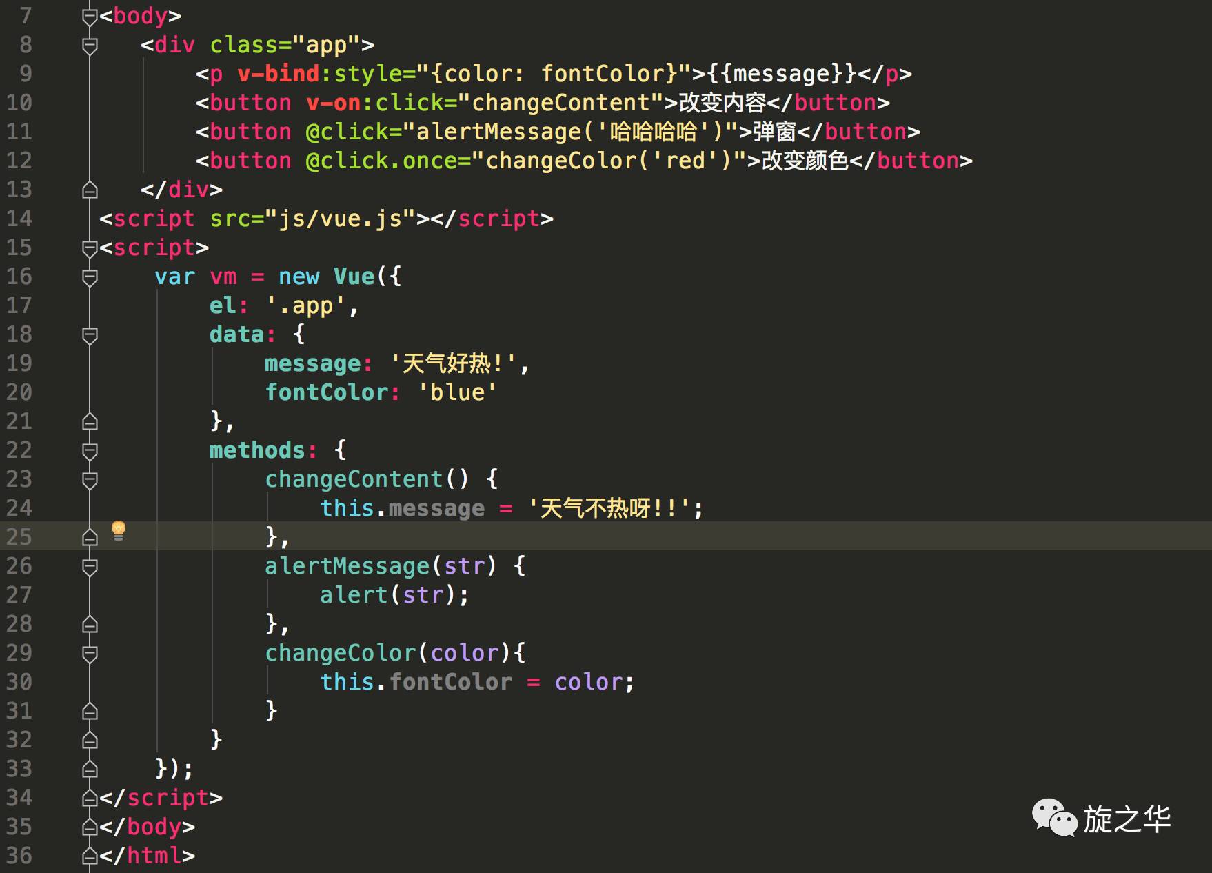 我们在上面案例中接触到了新的methods方法,通过这个方法可以直接通过 app 实例访问这些方法,或者在指令表达式中使用,方法中的 this 自动绑定为 Vue 实例。这在后面的章节中我们还会介绍。