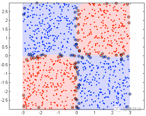 所有的蓝色点属于一类,红色属于另外一类。我们不考虑实际模型,首先,将X,Y值分成{x<0,x>=0}&{y<0,y>=0}对我们来说会很有用,将划分结果取名为{Xn,Xp}和{Yn,Yp}。很显然I&III象限对应于红色类别,II&IV象限是蓝色类。因此如果现在将特征X和特征Y组成成交叉特征,你会有四个象限特征,{I,II,III,IV}分别对应于{(Xp, Yp), (Xn, Yp), (Xn, Yn), (Xp, Yn)} 。