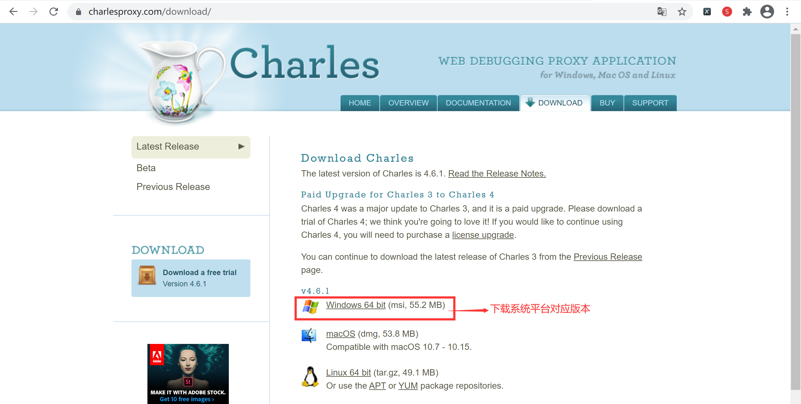 可以实现 App 抓包的工具有很多,例如, Charles、Fiddler、mitmproxy 等。不过从性能的角度来讲,Charles 的功能更加强大一些。Charles 抓包工具是收费软件,但可以免费试用 30 天。点击 此处 打开 Charles工具的官方下载页面,Charles 是一个跨平台网络抓包工具,支持 Windows、Mac 和 Linux 平台,读者可以根据自己的操作系统下载对应的版本即可。这里以 Windows 系统为例进行演示,如下图所示。