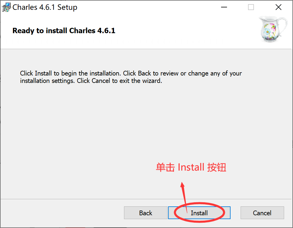 在 Ready to install Charles (准备安装) 对话框中,直接单击 Install 按钮,如下图所示。