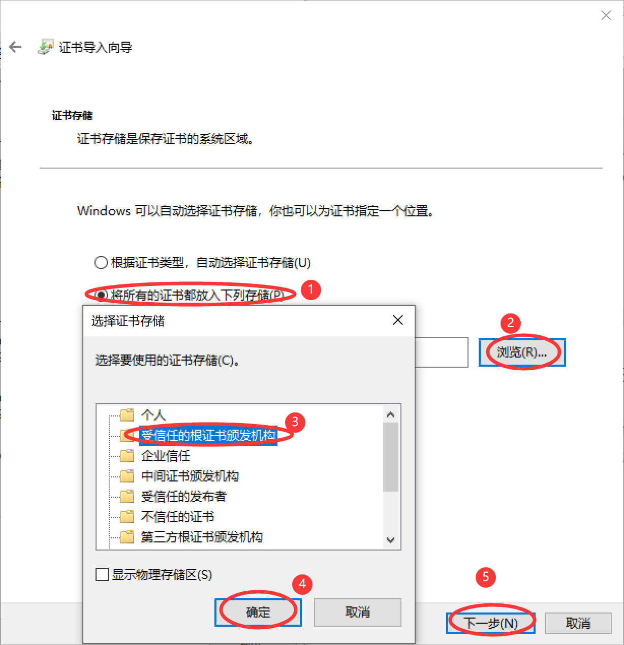 (3) 打开证书向导的 证书存储 对话框,在该对话框中首先选择 将所有的证书都放入下列存储 选项,然后单击 浏览 按钮,选择证书的存储位置为 受信任的根证书颁发机构,再单击 确定 按钮,最后单击 下一步 按钮即可。如图所示。