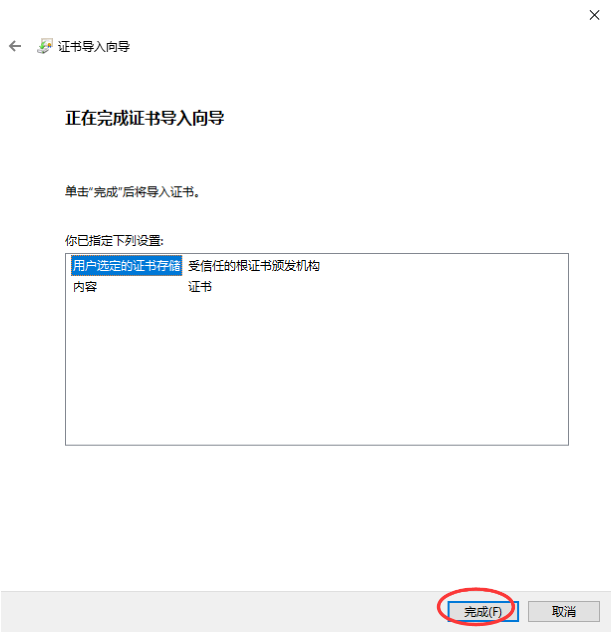 (4) 在证书导入向导的 正在完成证书导入向导 的对话框中,直接单击 完成 按钮,如图所示。