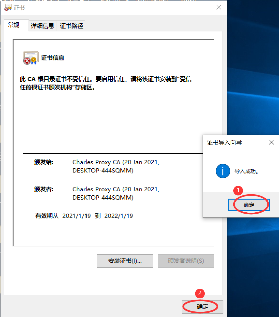 (6) 在 导入成功 的提示对话框中单击 确定 按钮,然后在安装证书的对话框中单击 确定 按钮,如图所示。