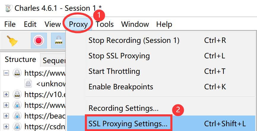 PC 端的 SSL 证书安装完成以后,在获取请求详情内容时依然显示乱码。此时还需要设置 SSL 代理,设置 SSL 代理的具体步骤如下: